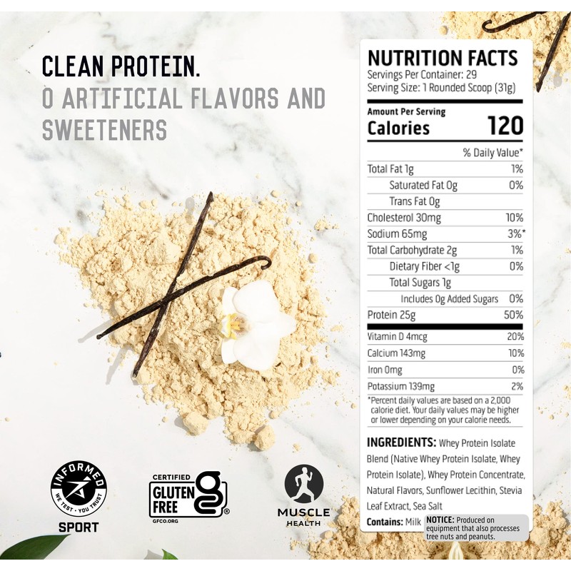 - 25g Protein Per Scoop - 5.7g Naturally Occurring BCAAs, and a clean, minimalist ingredient list. Certified Gluten Free and Informed Choice Certified. Lightly sweetened with stevia leaf extract.