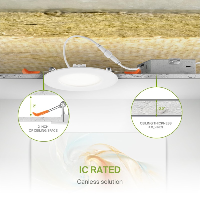 - 💡【High-Quality Design】- Our LED panel lights with a classic, low-profile design are an ideal solution for low ceilings. These canless lights have a J-box, plug & twist connector, spring-loaded clips, and require only 2" of ceiling space, making the installation process quick and easy. The acrylic lens with a 110° beam angle and CRI90+ grants you even light