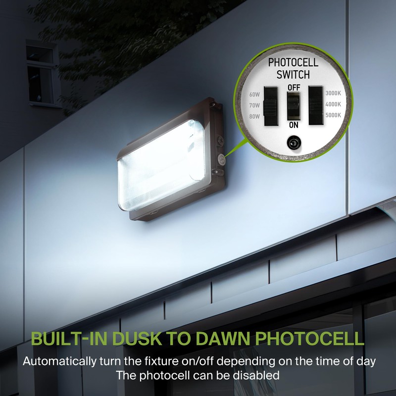 - ✅ PHOTOCELL - The built-in Dusk to Dawn Photocell will automatically turn the LED wallpack fixture on/off depending on the time of day. The photocell can be disabled with the switch