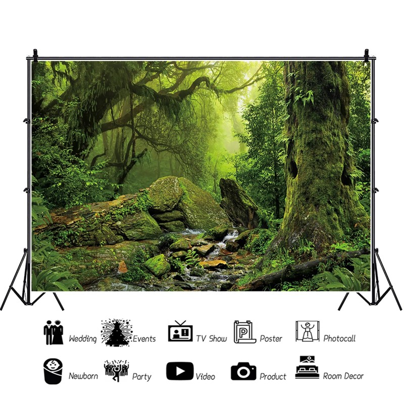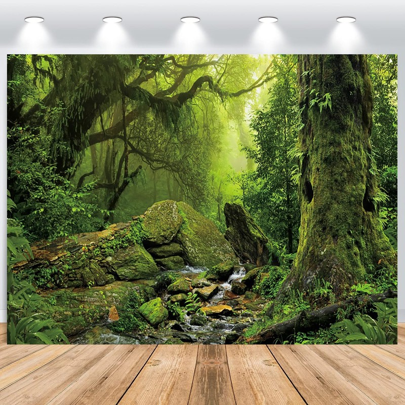 ASDCXZ Forest Background 3 x 2.5 m, Green Forest Jungle Streams Camping Photo Wall Background, Vinyl Photo Box Background for Birthday, Baby Shower, Forest Theme Party, Portrait Photo Studios
