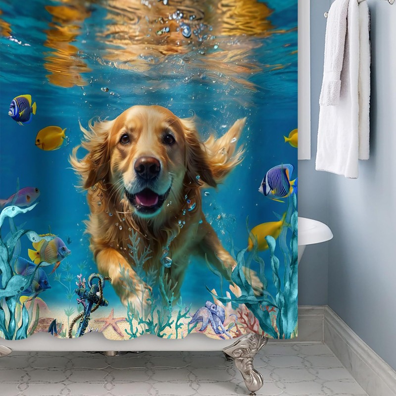 ASDCXZ Shower Curtain Dog 180 x 200 cm, Funny Dog Happy Swimming Underwater World Colourful Ocean Fish Washable Bath Shower Curtains Polyester Textile Waterproof Shower Curtain for Bath with 12 Hooks