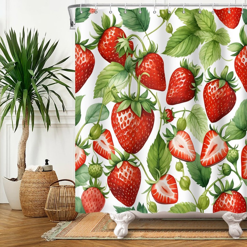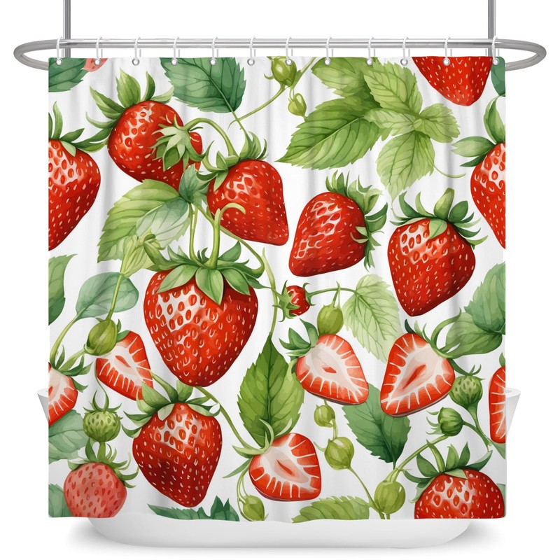 ASDCXZ Strawberry Shower Curtain 180 x 200 cm, Spring Summer Simplicity Red Strawberry Green Leaves White Bathroom Washable Shower Curtains Polyester Textile Waterproof Bath Curtain for Bath with 12