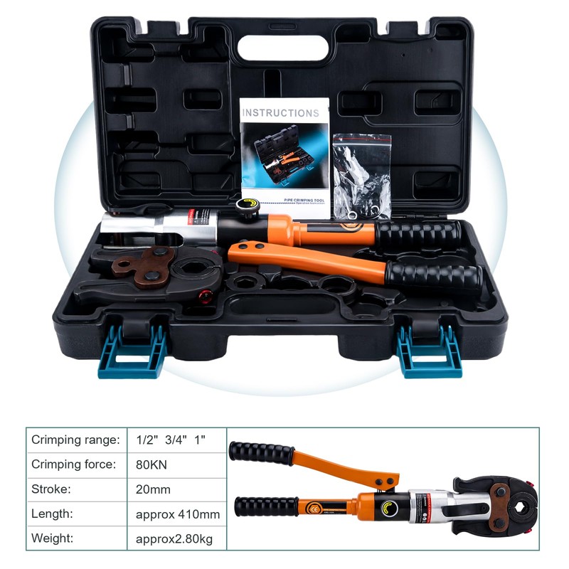 Product Description ASDFGHT Hydraulic copper pipe crimping tool 1. The Copper Tube Fitting Crimping Tool is the perfect solution for anyone who needs to work in tight spaces or with small fittings. This tool is specifically designed to work with 1/2”, 3/4”, and 1” copper pipes and is compatible with Viega Copper Pipe Fittings. 2. One of the key features of this tool is its durable aluminum alloy body, which effectively prevents oil leakage and ensures that it will last for years to come. Additionally, the head of the tool can be rotated up to 360 degrees, making it easy to use in any position. 3. The tool utilizes a hydraulic mechanism to ensure a secure and reliable crimp every time. This makes it perfect for use in both commercial and residential applications. 4. With its portable design, the Copper Tube Fitting Crimping Tool is easy to take on the go and use wherever you need it. Whether you're a professional plumber or just a DIY enthusiast, this tool is sure to make your job easier and more efficient. 5. So if you're looking for a reliable and easy-to-use tool for crimping copper tube fittings, look no further than the ASDFGHT hydraulic fitting crimping tool.