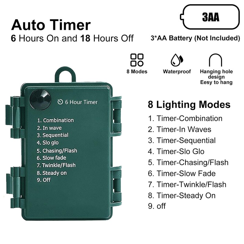 - SMART AUTO TIMER - Automatically keep 6 hours on and then 18 hours off each day, to free your hands and avoid forgetting to turn off the Christmas lights and save energy greatly