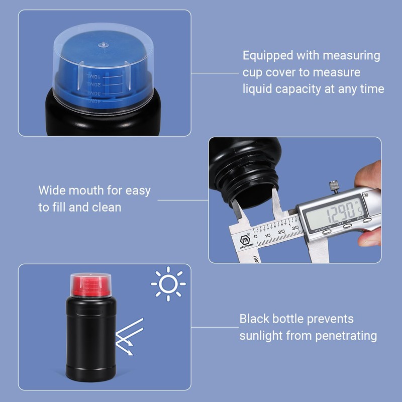 • HIGHLY COMPATIBLE & VERSATILE: Plastic storage containers with lids are suitable for all photographic chemicals, including developers, bottle stoppers, and fixers. Darkroom bottles can also be used for liquid dispensing, reagents, solid powders, and sample storage, meeting a wide range of experimental needs. Chemical storage bottles are widely used in laboratories, classrooms, homes, personal use, hobbies, and industrial applications.