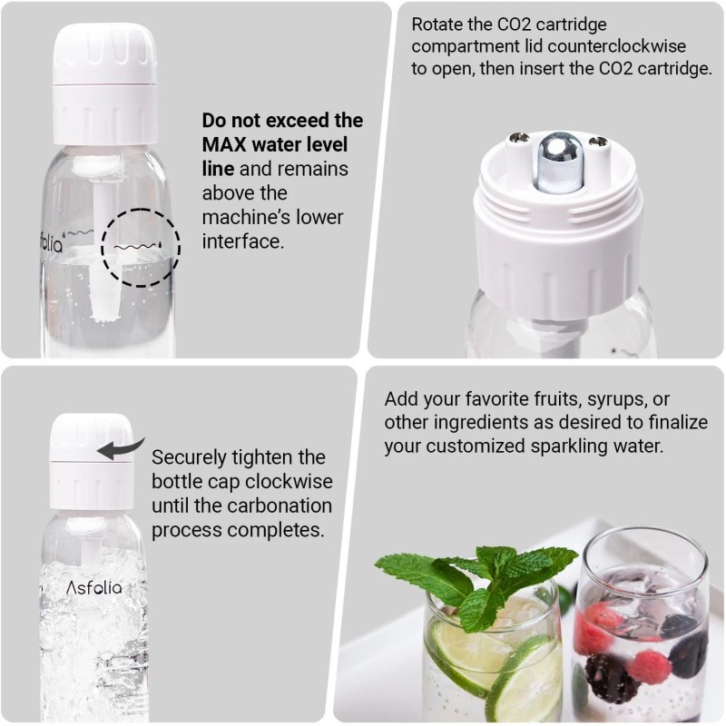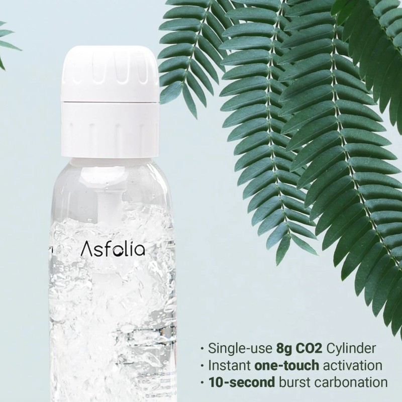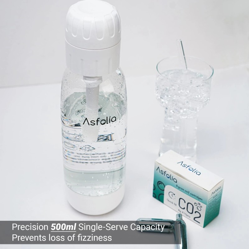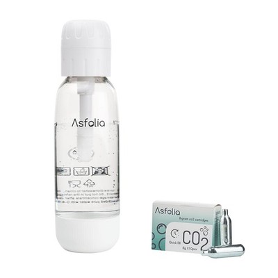 - Package Contents: You will receive an Asfolia AquaBub series sparkling water maker, which includes 10 COz cartridges and a 500ml PET carbonation bottle. The bottle comes with a lid to help seal in the carbonation for a longer period. This soda maker is compatible with Asfolia's 8g COz cartridges. If you need additional COz cartridges, you can purchase them in our store