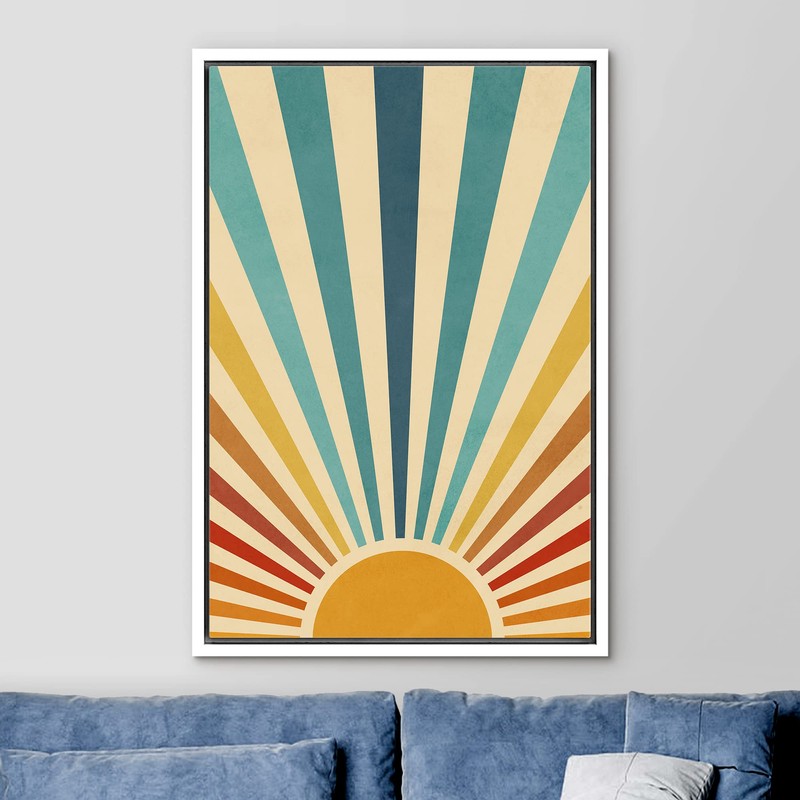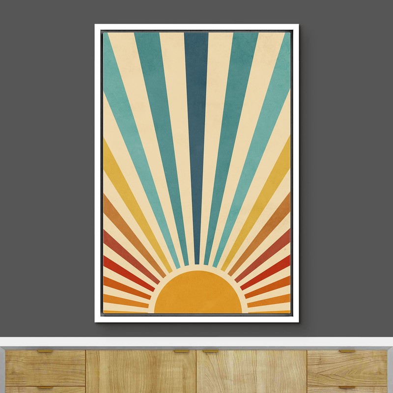 Ashbrook Framed Canvas Print Wall Art Sun with Blue, Red and Yellow Sunlight Rays Nature Wilderness Illustrations Modern Rustic Scenic Relax/Calm for Living Room, Bedroom, Office - 16"x24" WHITE