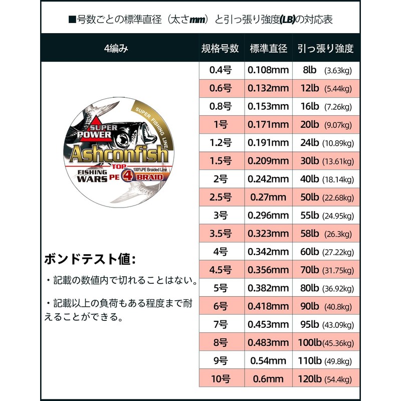 - Proprietary Uniform Braiding Technology: A characteristic of polyethylene line is that when it has sections where the braiding is uneven, the line can break in those spots when strong, sudden force is applied, such as when the line is pulled forcefully. However, with its proprietary uniform braiding technology, Ashconfish has succeeded in eliminating uneven braiding to the greatest possible extent. If there’s a sudden jolt on the line, the force of the impact is evenly distributed throughout the braid to prevent line breakage upon striking. We have also increased the line’s durability and its resistance to line memory and entanglement, to create a more reliable tool for anglers.
