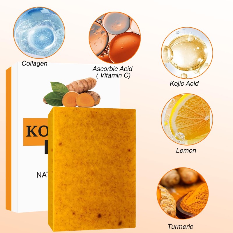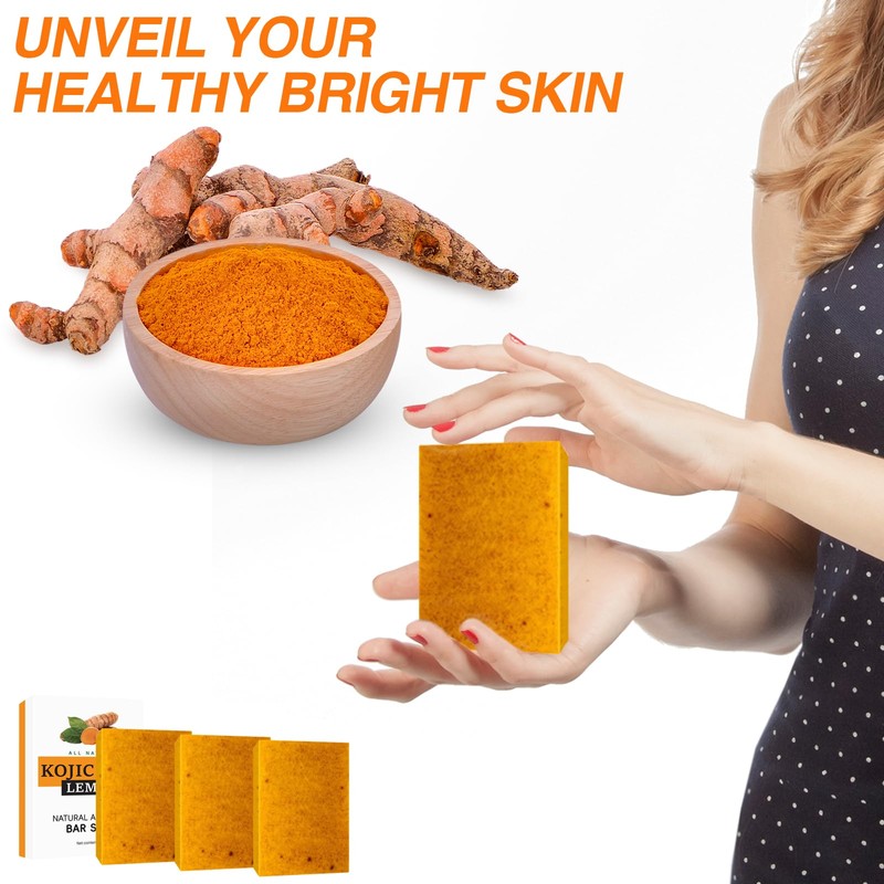 - Organic Ingredients: This turmeric soap is made with turmeric, lemon acid and kojic acid, known for their skin-benefiting properties