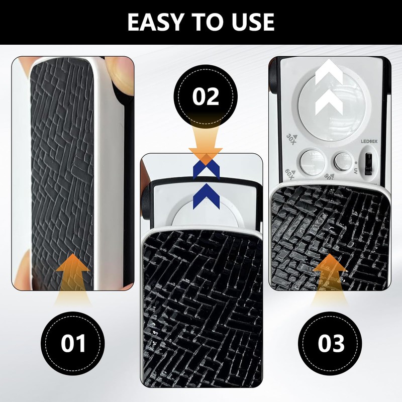 • Dual Illumination System: Built-in bright LED and UV light (powered by three LR44 batteries) provide optimal illumination for any viewing condition