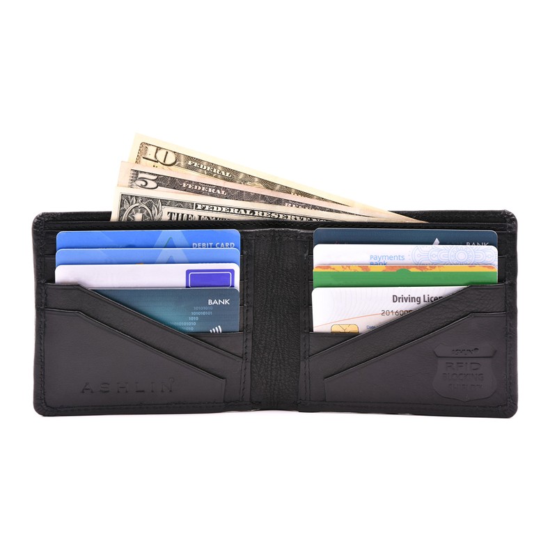 Featuring a double billfold, 4 angled pockets and 8 standard pockets, you can store up to 12 cards in this slim and stylish mens wallet.Our RFID blocking shield adds an extra layer of protection which prevents your chip cards from being skimmed.