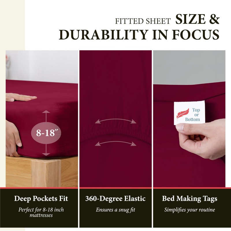 - Deep Pockets & Secure Fit: No more slipping or bunching—our fitted sheet stays in place, even if you toss and turn at night. Designed to fit adjustable mattresses up to 16 inches deep, the smart tags indicate the correct orientation for effortless bed-making. The 4-piece queen-size bed set includes: 1 Flat Sheet (90” W x 102” L), 1 Fitted Sheet (60” W x 80” L + 16” deep pocket) and 2 Pillowcases (21” W x 32” L)
