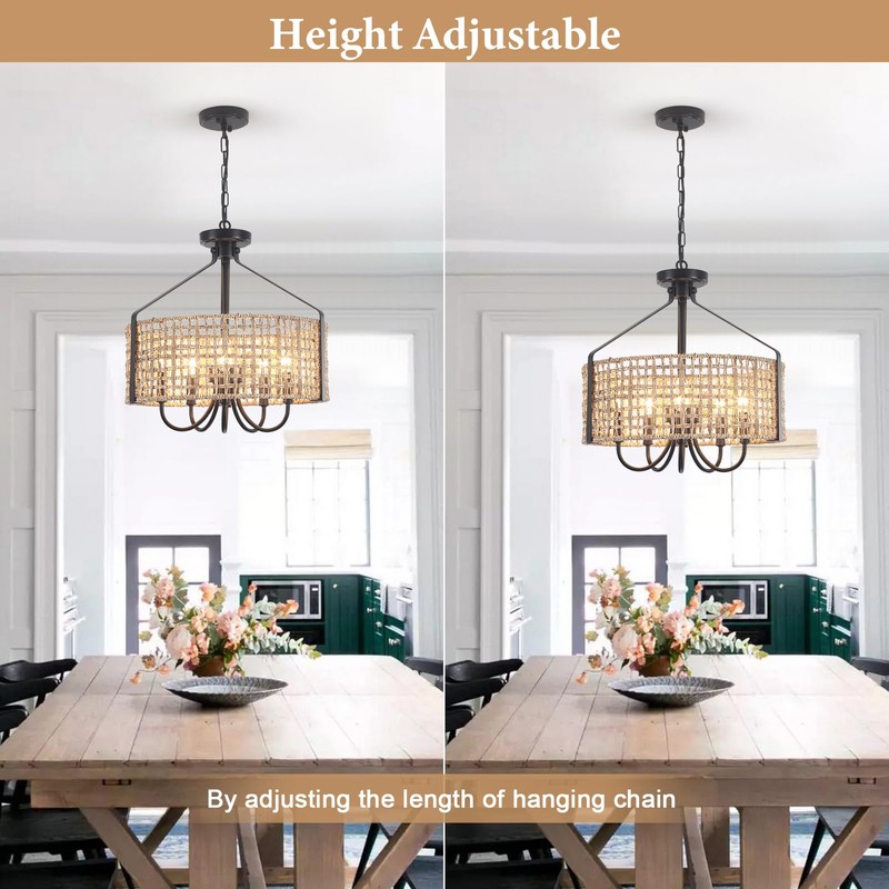 - Height Adjustable: The wicker chandelier comes with a 59.05'' hanging chain and two removable buckles, which allows you to customize the height of the boho pendant light to match your space design, Max height: 80.11'', Min height: 27.55''