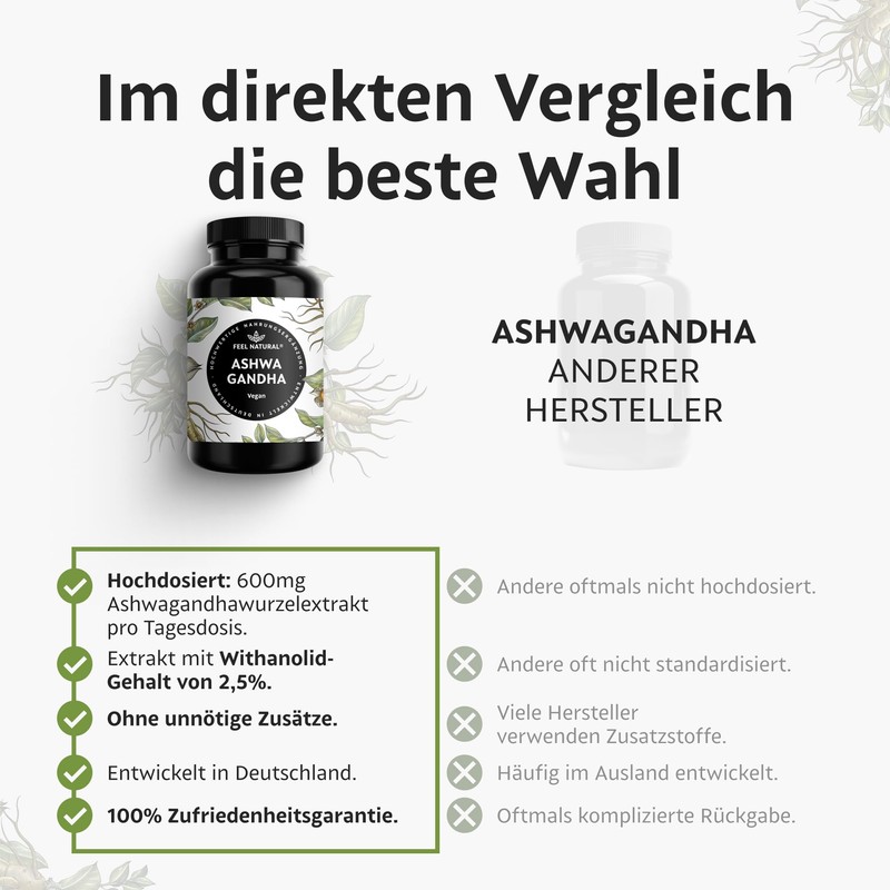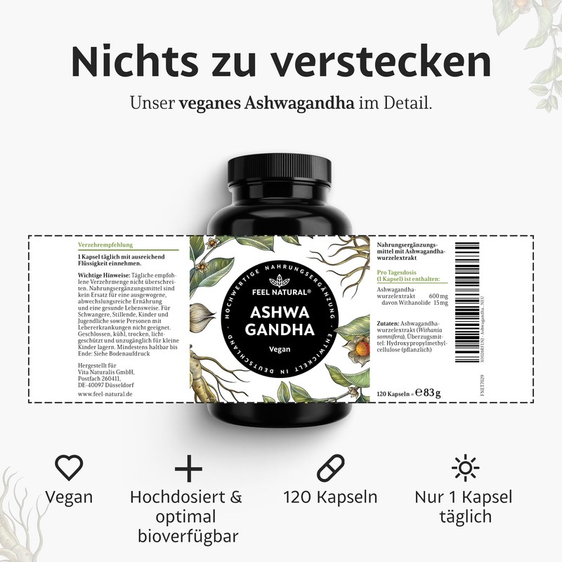 - Standard quality: 1 high-dose Ashwagandha capsule contains 600 mg standardised ashwagandha root extract with 15 mg withanolide. 120 vegan capsules are enough for 4 months. Simply take 1 optimally bioavailable capsule before bedtime.