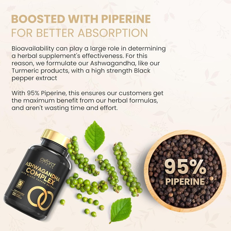 - ✔️ BOOSTED WITH PIPERINE FOR BETTER ABSORPTION - Bioavailability can play a large role in determining a herbal supplement's effectiveness. For this reason, we formulate our Ashwagandha, like our Turmeric products, with a high strength Black pepper extract. With 95% Piperine, this ensures our customers get the maximum benefit from our herbal formulas, and aren't wasting time and effort.