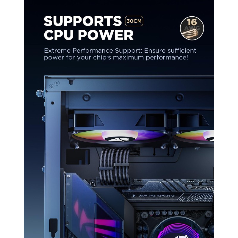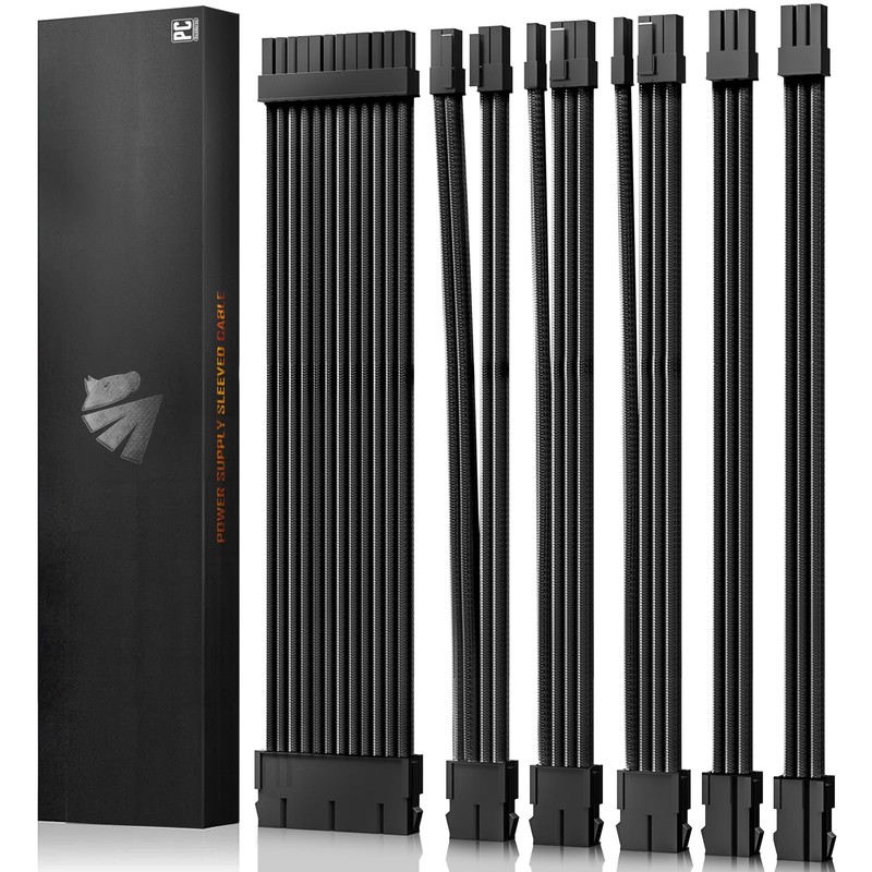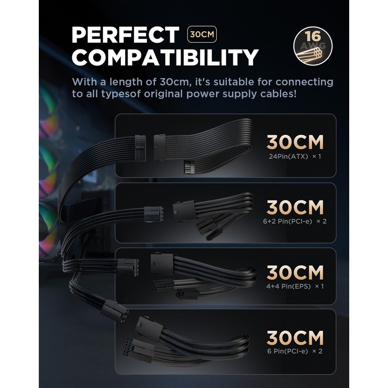 - 【PSU Extension Cable Kit】1x24 Pin ATX Extension Cable (for Motherboard), 1x (4+4) Pin EPS Cable (for CPU), 2 x 6+2-Pin PCI-e Cable and 2 x 6-Pin PCI-e Cable (for GPU), supplied two sets of cable combs, compatible with all power supply cables (must be connected to the power cable, not to the power supply)