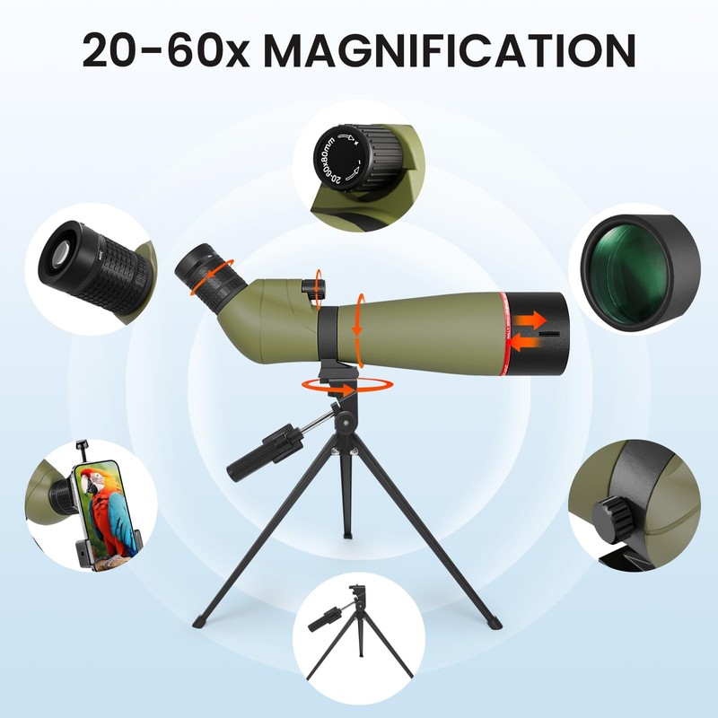 - 【HD Magnification】spotting scopes has Variable 20x to 60x magnification and dynamic lens focusing system - makes it easy to zoom in. field of view is 1000M, also comes with a tripod, phone adapter, carrying bag.Perfect for archery, bird watching, wildlife watching, hiking, camping, scenery, outdoor sporting, astronomical observation etc.