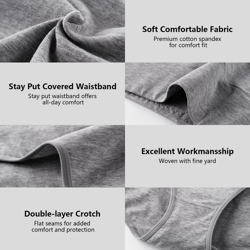 - Cotton Stretch underwear:Cotton & spandex offer a smooth, soft comfortable feel with plenty of stretch,no pilling, no pinching, no binding, not too tight but not loose,reduces the appearance of muffin top. cotton has fine permeability which keeps you feel comfortable,mosicture wicking underwear also keep dry and skin friendly.