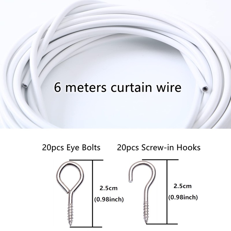 - Package contents: 6 meters curtain wire,20pcs Eye Bolts and 20pcs Screw-in Hooks ; The complete curtain accessories are suitable for both wood windows and metal windows