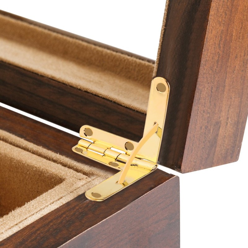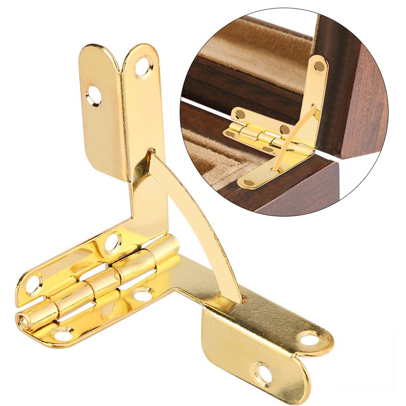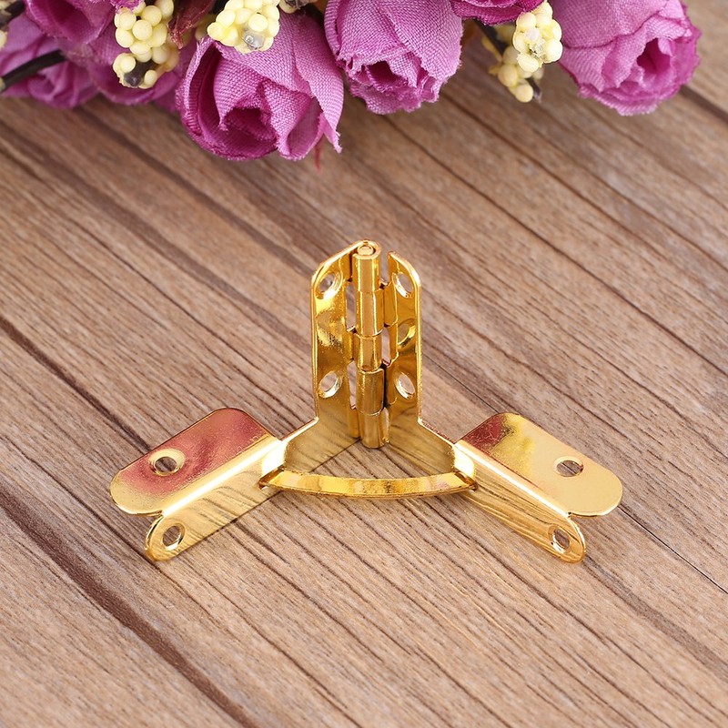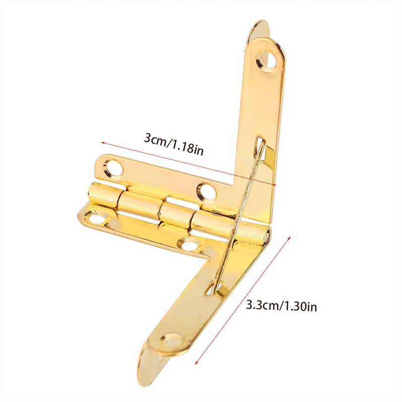 **Description:** This spring hinge is L-shaped, suitable for kinds of plastic, wood and metal case or box, such as jewelry case and watch box. It makes the opening and closing of case flexible and effortless. **Specifications:** Condition: 100% Brand New Material: Iron Color: Gold, Bronze(Optional) Opening Angle: 90° Each Size: approx. 3 x 3.3cm / 1.2 x 1.3inch Weight: approx. 190g **Package Included:** 20 x Hinges 1 x Bag of Screw **Note:** 1\. Please allow slight error due to manual measurement. Thanks for your understanding. 2\. Monitors are not calibrated same, item color displayed in photos may be showing slightly different from the real object. Please take the real one as standard.