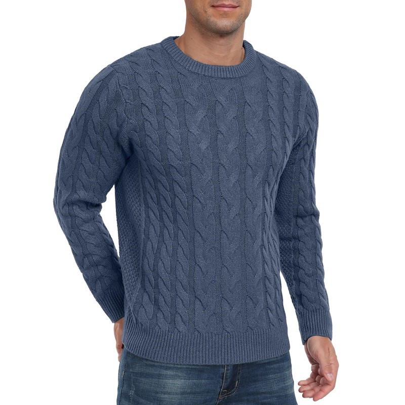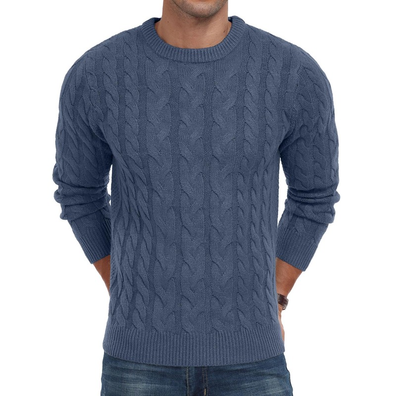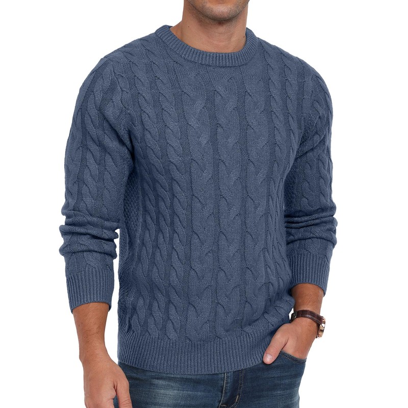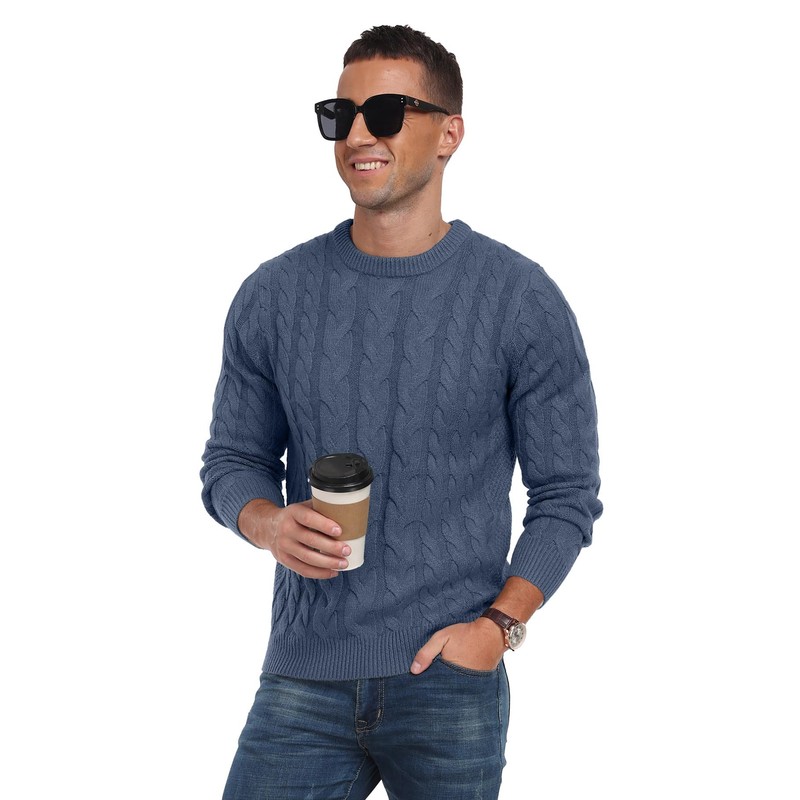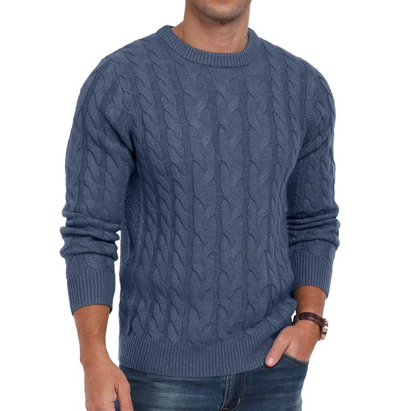 Askdeer Men's Crewneck Pullover Sweater Chunky Cable Knit Sweater Classic Casual Sweaters with Ribbing Edge Denim Blue