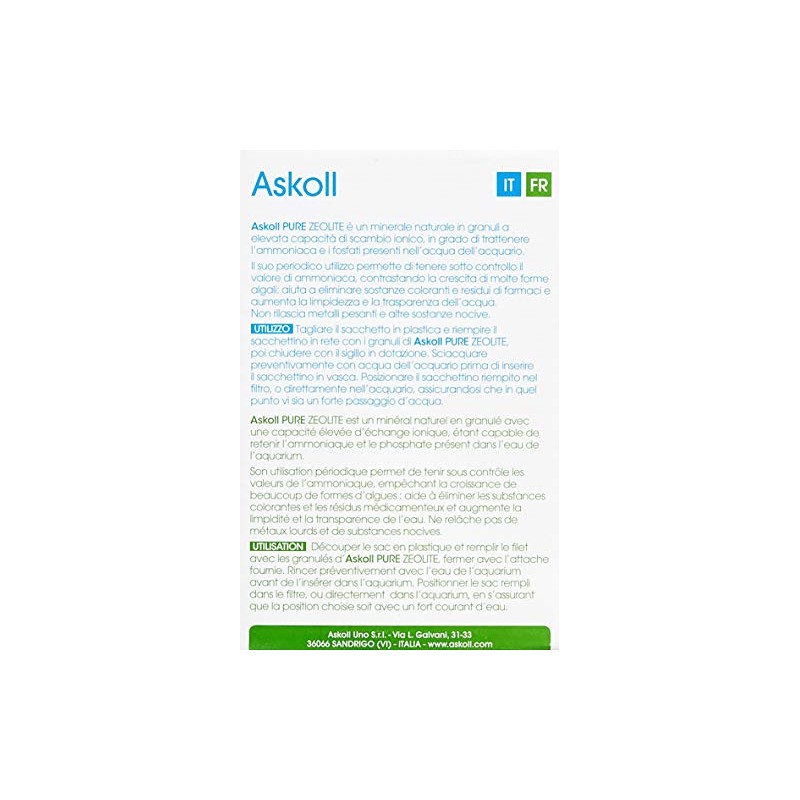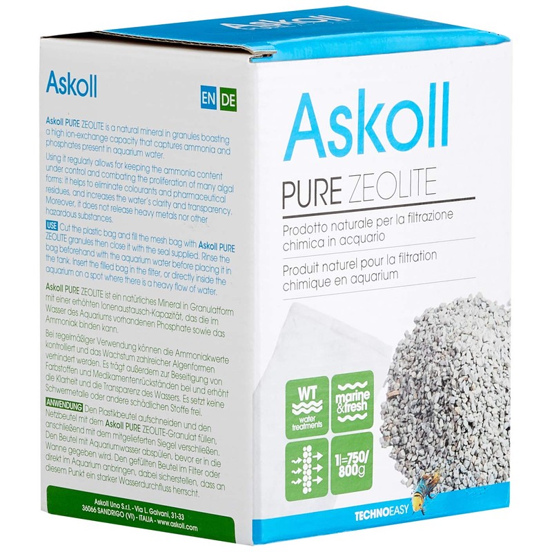 - Askoll Zeolite is a natural mineral granules with high ion exchange capacity that can absorb ammonia and phosphates in aquarium water.