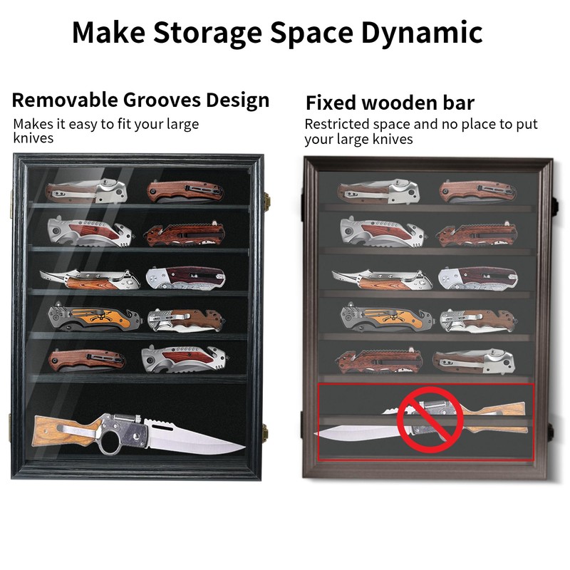 - REMOVABLE SHELVES: The knife case has 6 detachable shelves, providing flexible customization and neat organization. Remove Middle Shelves ensure a display of different sizes knives, and each shelf has grooves to prevent the knife from sliding. Alternatively, folded knives can be laid flat, allowing for a diverse presentation of your collection.