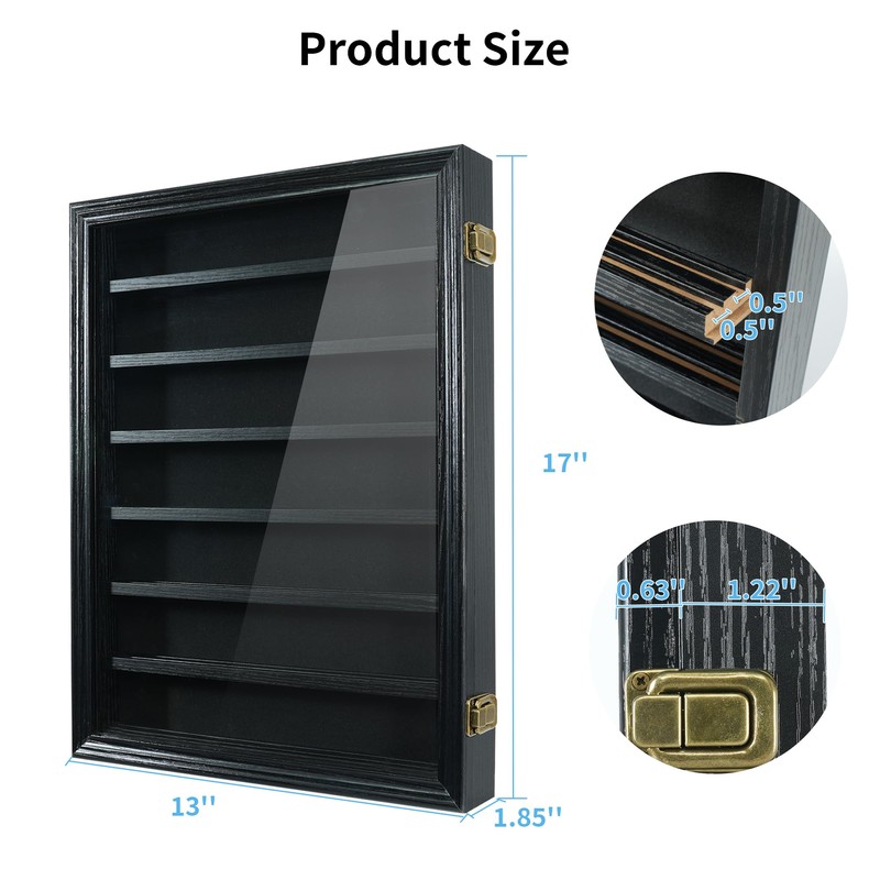 - WALL MOUNTED KNIFE DISPLAY CABINET: The knife display cabinet is made of wood. Pocket knife display case exudes sophistication while ensuring long-lasting durability. The premium materials showcase your collection in style. Outside frame size: 16.93''L x1.93"Wx13"H, Compartment is 1.85" high, Inner Depth: 1.22". Therefore, if any part of your knife is thicker than 1.22", they will not be inserted. (NOTE: Not Include Knife)