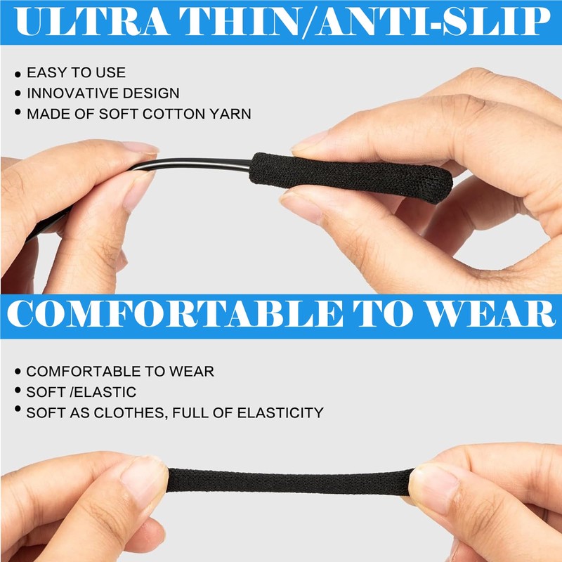 3.Comfortable design: the glasses ear pads are made of soft cotton knit material, glasses pads for the ears provide cushioning and friction, which reduce the pressure on the ears and provide better grip, glasses pads for the ears provide excellent comfort when wearing glasses.