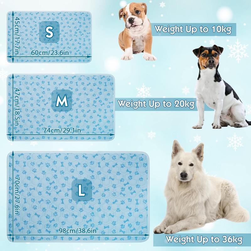 • 【Dog Cooling Mat, Pad & Bed Sizes & Tips】Small Cooling Pad/ Mat: 17.7" x 23.6" (Great for compact spaces!)Medium Cooling Pad / Bed: 18.5" x 29.1" (Ideal for most breeds!) Large Cooling Bed / Blanket: 27.6" x 38.6" (Perfect for big dogs!)