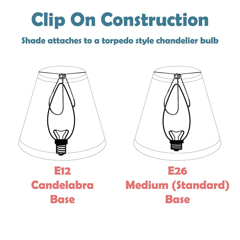 • Clip-on style fitter designed for bare torpedo chandelier bulbs (bend tip bulbs not recommended) either in candelabra base (E12) or medium base (E26), light bulbs not included