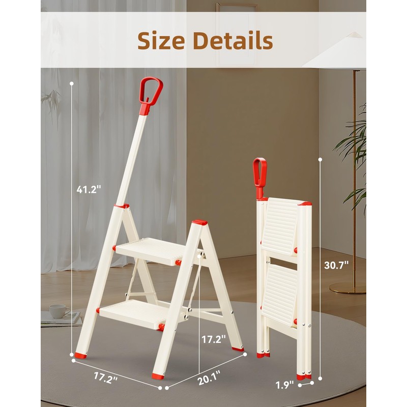 • 【Multipurpose ladder for home】Open size:41.2x 17.2 x 27.2 inches Folding size: 30.7 x 17.2 x 1.9 inches; Suitable for daily home cleaning up and organization.This small 2 step ladder is not only suitable for daily household cleaning and organization, but can also be used as a shelf to stack books and plants.You can even use it as a chair when friends come to your home.