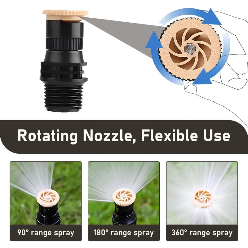 - Verstellbare Sprühdüse – Die Sprühdüse lässt sich auf 0-360° einstellen, um die Bewässerung flexibel an Ihre Bedürfnisse anzupassen. Die kreisregner einstellbar maximale Reichweite beträgt 4-6m, ideal für kleine bis mittelgroße Gärten.