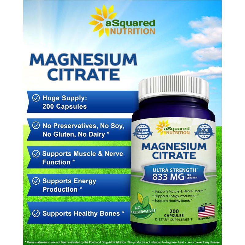 aSquared Nutrition Magnesium Citrate 833mg Supplement - 200 Capsules - Max Strength Vegan Mag Citrate Powder Pills to Support Pure Function of Muscles, Heart & Bones - Helps Increase Energy