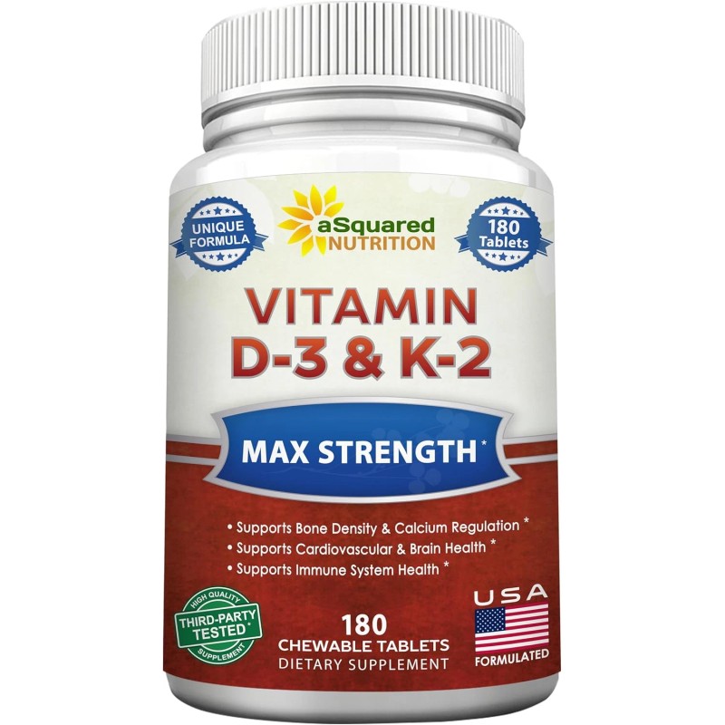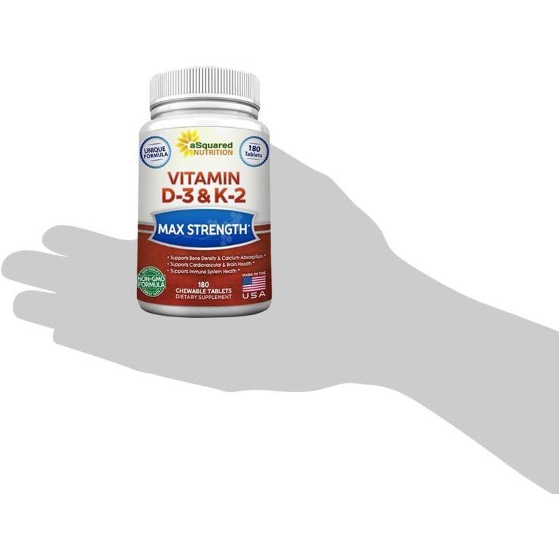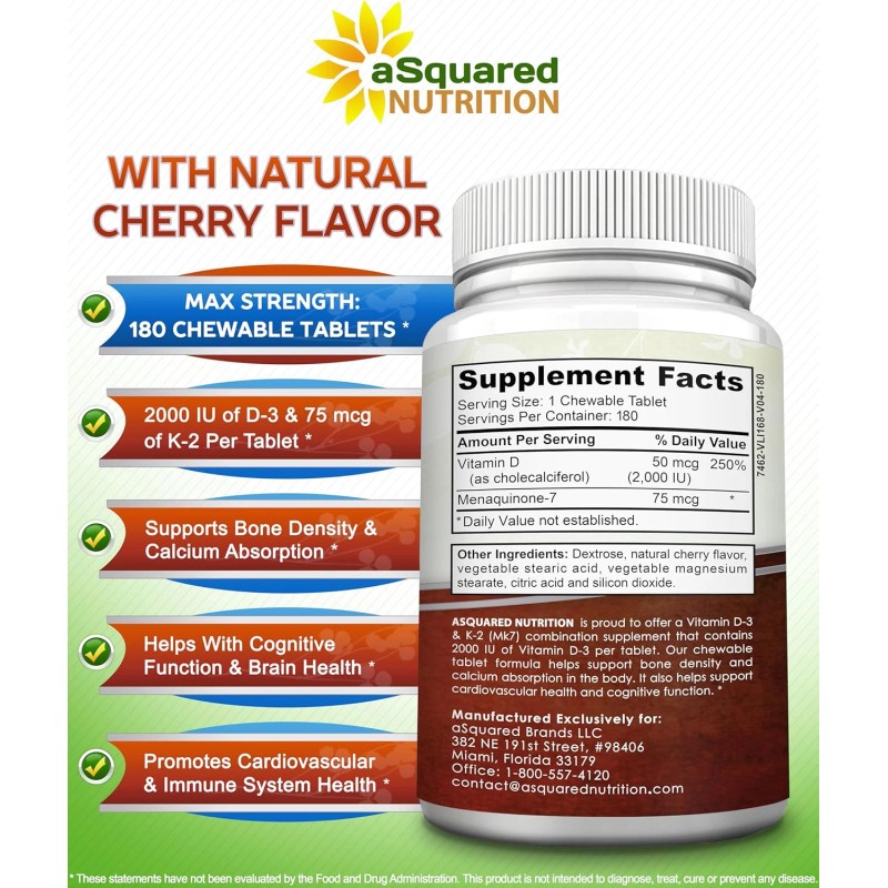 - MAXIMUM STRENGTH VITAMIN D3 & K2 (Mk7): Our Vitamin D3 + K2 supplement contains 180 maximum strength chewable cherry-flavored tablets in each bottle, enabling quick and enhanced absorption into the body. Our unique formula supports bone density and calcium absorption, as well as healthy teeth. It also supports cognitive function and brain health, while also promoting cardiovascular and immune system health. *