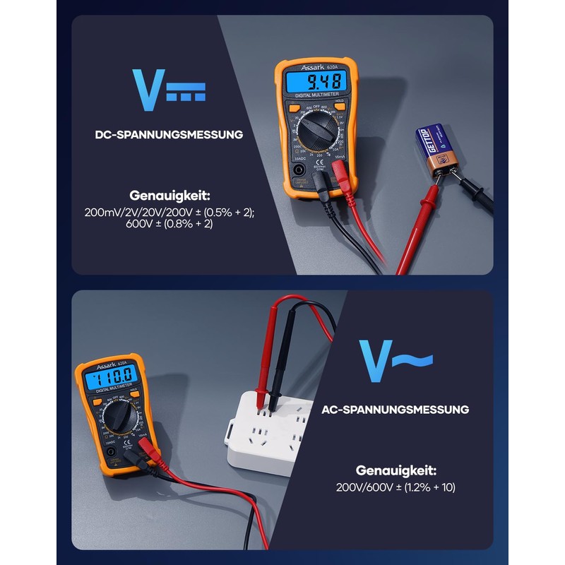 Assark Digital Multimeter Voltmeter Batterietester Spannungsprfer AC/DC Spannung Strom Prfer Durchgangsprfer Ohm Volt Ampere Messger?t Widerstand Diode Transistor Tester-Messger?t LCD Bildschirm