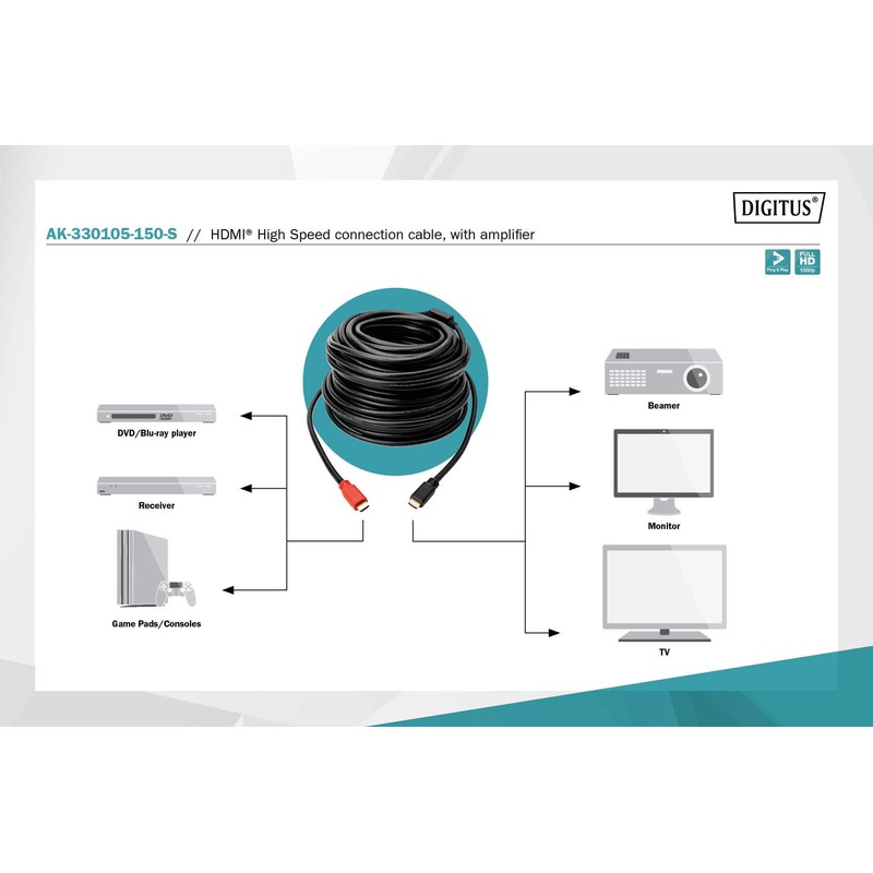 Assmann AK-330105-150-S High Speed HDMI Cable with Amplifier Type A Male to Type A Male