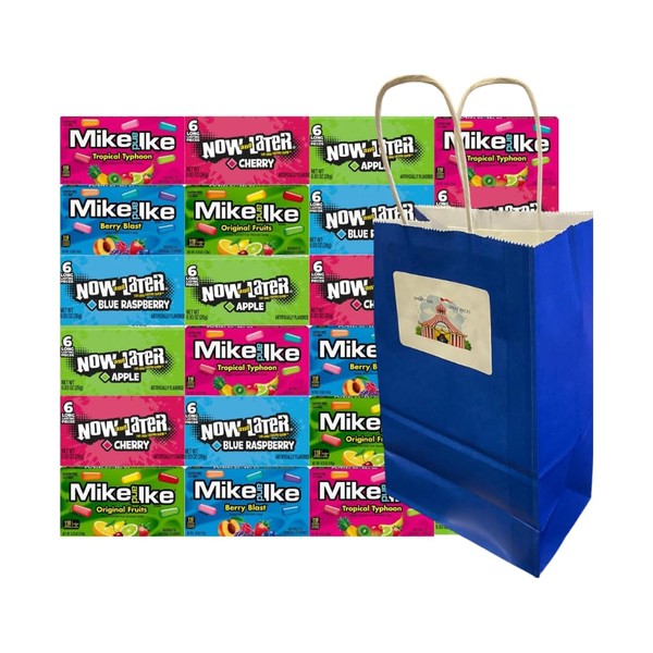 Assorted Candy Mix 24-Pack with Mike and Ike & Now and Later Individually Wrapped Candies – Includes Original Fruits, Tropical, Cherry, Apple, Berry – With Blue Treat Bag 5.25x3.2x8