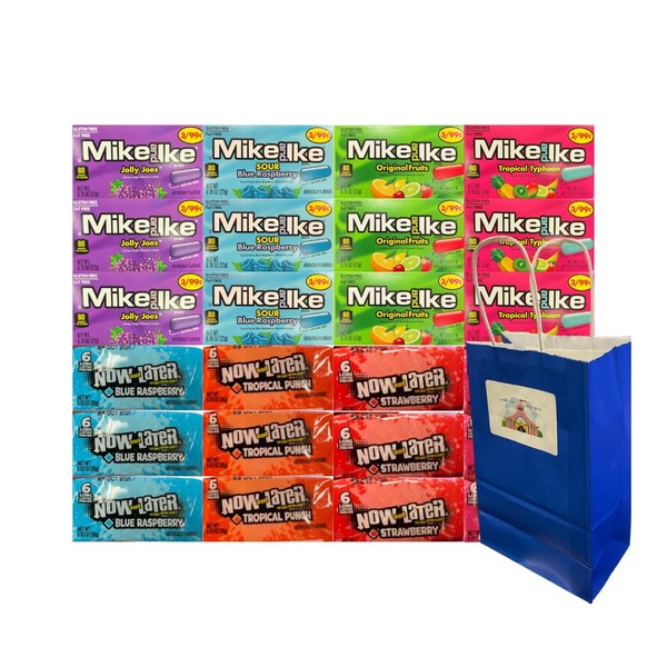 Assorted Candy Mix Variety Pack 24 Count – 4 Flavors Each of Mike and Ike & Now and Later – Chewy Fruity Candy – Party Snack with Blue Paper Bag