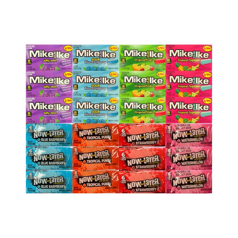 • Great Value Assortment – 24 total pieces with 3 of each flavor. A premium mix of chewy, fruity candies from two top-selling brands, Mike and Ike & Now and Later.