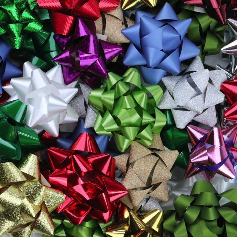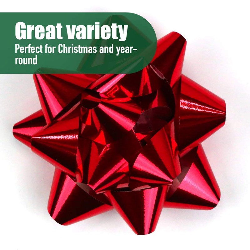- GREAT VARIETY - These gift bows come in an assortment of holiday colors and textures. The finish on these bows include matte, shiny, metallic, and micro glitter. This large variety pack is perfect for the ultimate gift wrapper!