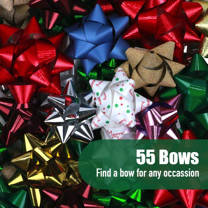 - PREMIUM CHRISTMAS/HOLIDAY BOWS - These gift bows are the perfect way to decorate your presents this holiday. This variety pack of holiday bows includes 55 bows in 4 different sizes measuring from small (3") to large (4").