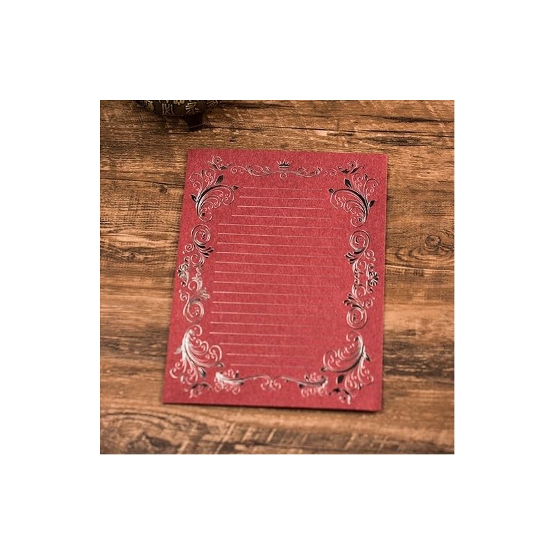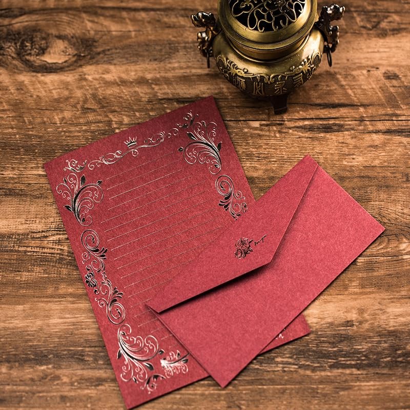 • Hot Stamping Paper:Total of 3 colors-pitted yellow(yellow letter paper), cream beige(cream paper) and burgundy paper(paper red letter with envelope). Every vintage stationery set contains 3 papers & 3 envelopes in identical color.