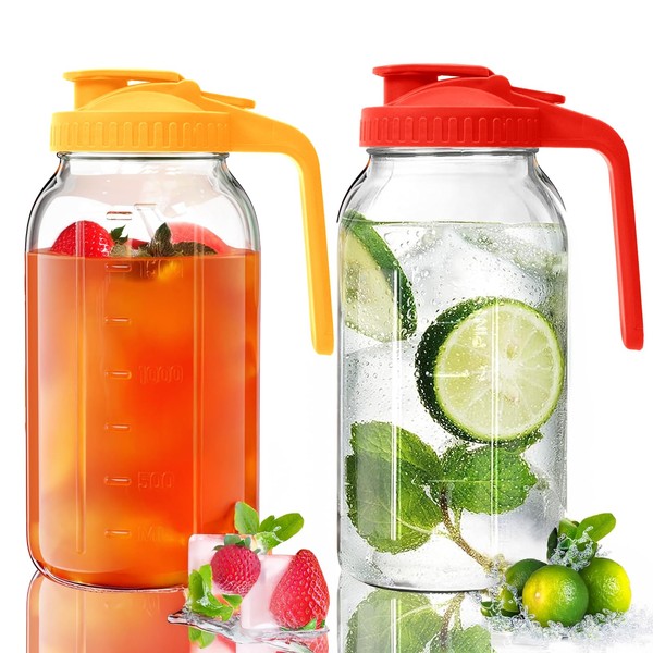 AsstarJTK 2 Pack Glass Mason Jar Pitcher - 64 oz/2 Quart Wide Mouth Jug with Lid and Pour Spout, Airtight Seal, Leak Proof Iced Tea Pitcher for Sun Tea, Juice, Breast Milk, Cold Beverages, Coffe