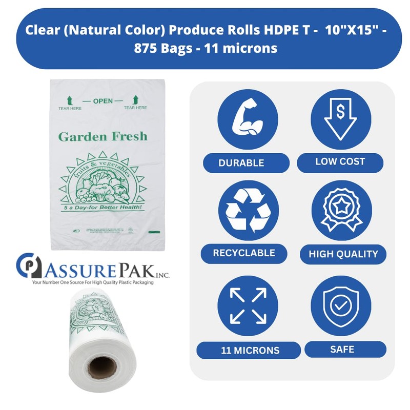 ASSUREPAK Clear (Natural Color) Produce Rolls (HDPE) - 10"X15" - 875 Bags- 1 Roll - 11 microns - Clear