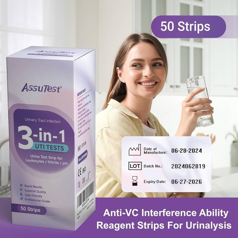 AssuTest UTI Test Strips - 3-in-1 Advanced Urinary Tract Infection Home Testing Testing Kit Detection with Accurate Leukocytes, Nitrite, and PH Readings, Simple at-Home Urine Test Strips, 50ct