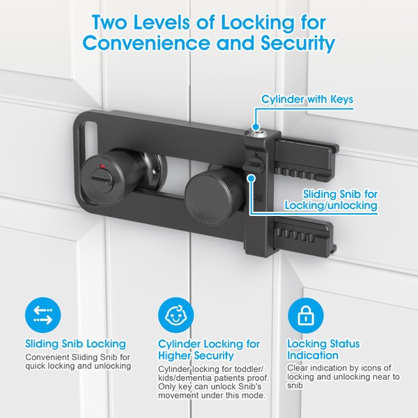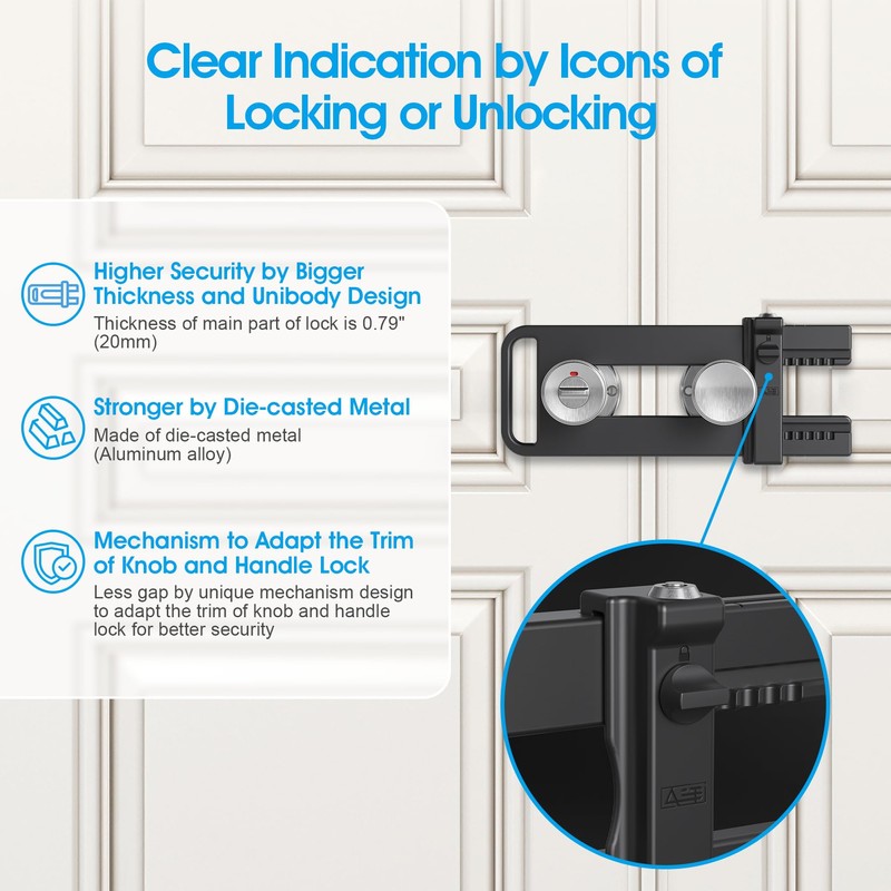 • [Suits for Knobset and Handle set]: This dementia door lock for double door and french door as double baby proof double door handle lock, is designed with bigger range of adjustment, it suits most of knobset and some handleset with tighter locking, locking status indications are presented clearly. It can be used as a portable door lock, removeable door lock and no drilling lock without any installtion.