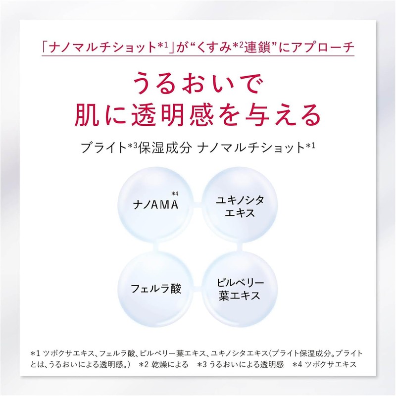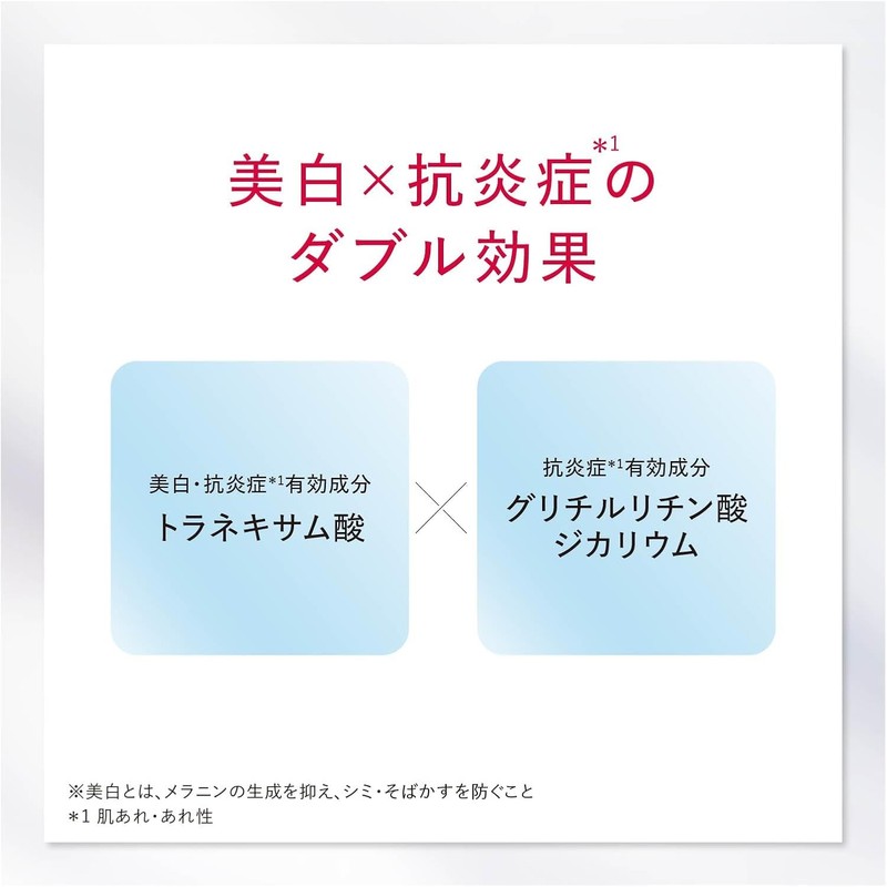 - [For those who] Feel that their skin is gradually getting duller with age (*1) ・Even after repeated whitening treatments, they feel that the treatment is not ideal ・Want to thoroughly moisturize even with whitening treatments ・Want to achieve a hydrated, clear skin, firmness, and moisturizing effect all at once (※Whitening means suppressing melanin production and preventing blemishes and freckles. *1 Caused by dryness)