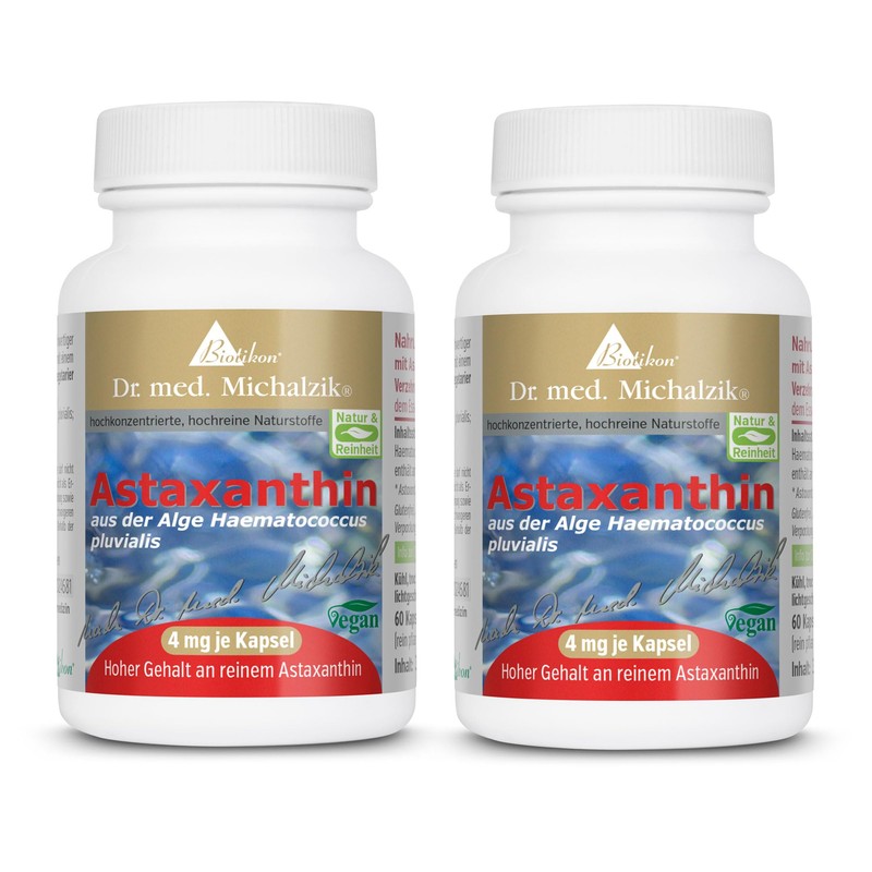 Astaxanthin according to Dr. Michalzik contains 4 mg of pure astaxanthin per vegetarian capsule. The algae Haematococcus pluvialis provides this high content of astaxanthin. Capsule filling free from all additives. The Astaxatnhin content is measured using the RP-HPLC method. Often only UV measurements are taken.