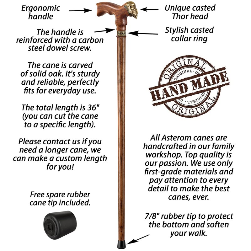 Asterom Cane - Handmade Viking Walking Cane - Canes for Men - Wooden, Unique, Cool, Walking Sticks for Men & Seniors (Thor in Caramel)